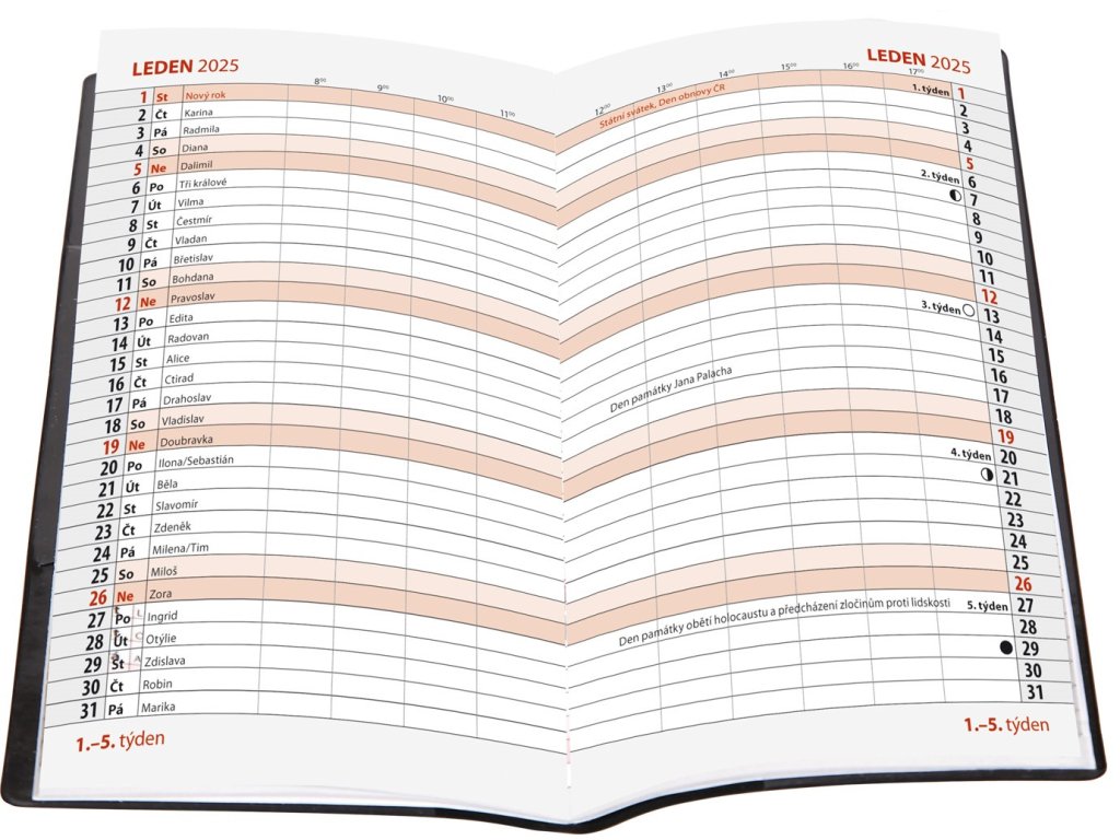 Formát: 75 x 115 mm, Počet stran: 32, Kalendárium: měsíční kalendárium, fáze měsíce, Informační stránky: plán. kalendář 2025, tabulkové kalendáře 2025 a 2026, poznámky