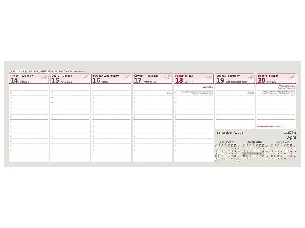 Formát kalendáře: 33,6 x 12,1 cm Kalendárium: české týdenní sloupcové + AJ Počet stran kalendáře: 64 + 2 Stojánek: se zámkem Prostor pro přítisk: 33,6 x 3,5 cm + daně, roční období, znamení zvěrokruhu, citáty, EU svátky, 3měsíční přehled + 4 x praktická záložkaDoplňkové parametry
