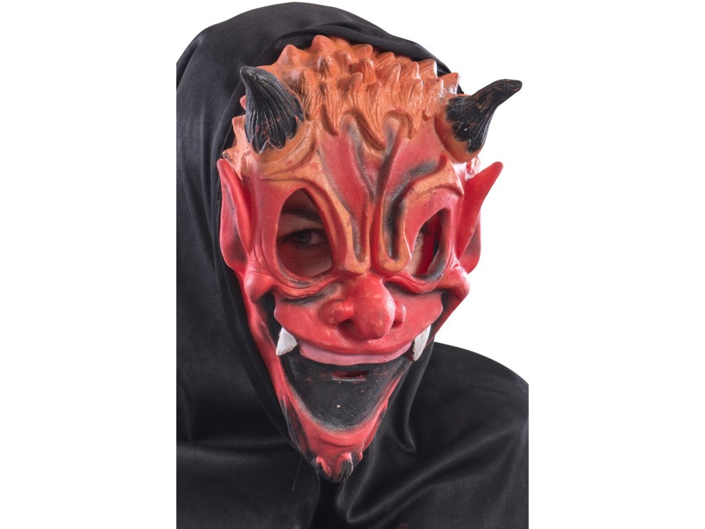 Latexová maska čerta s kapucí z tkaniny, velká ústa s dlouhými špičáky. Dětská velikost. Materiál: latex, polyesterDoplňkové parametry