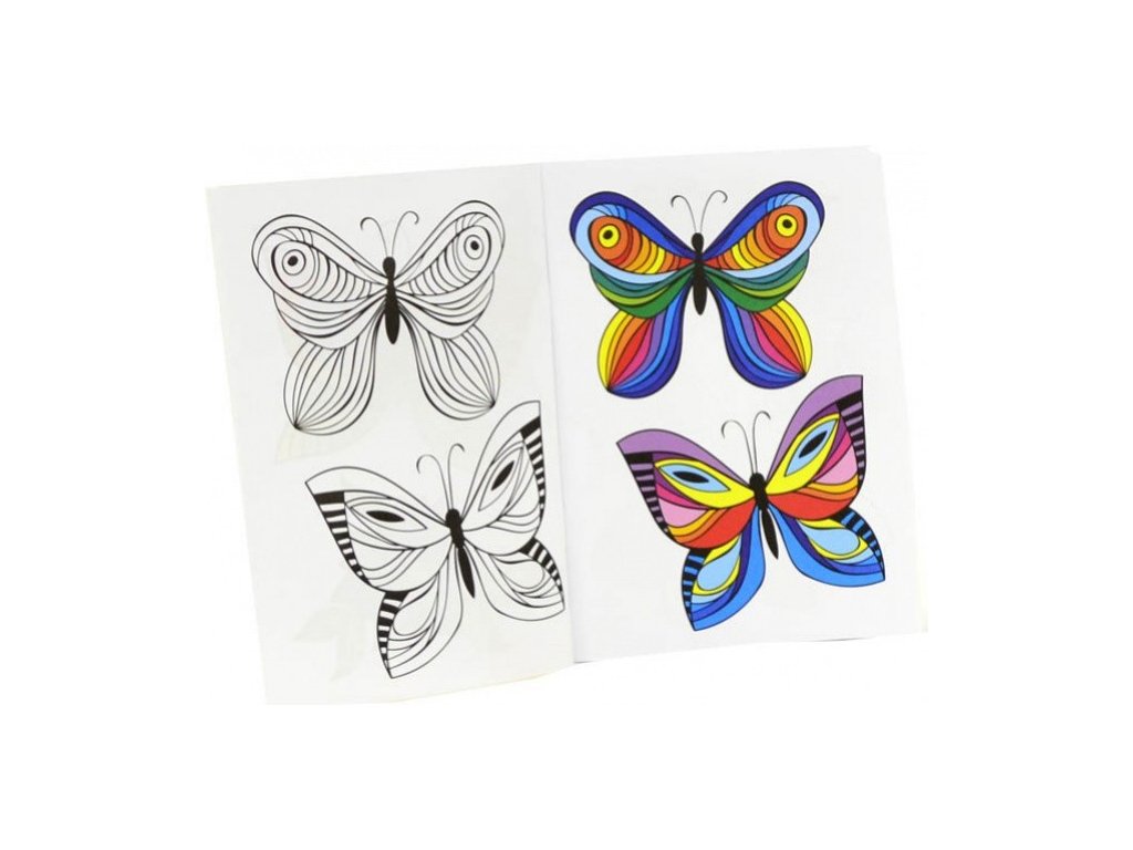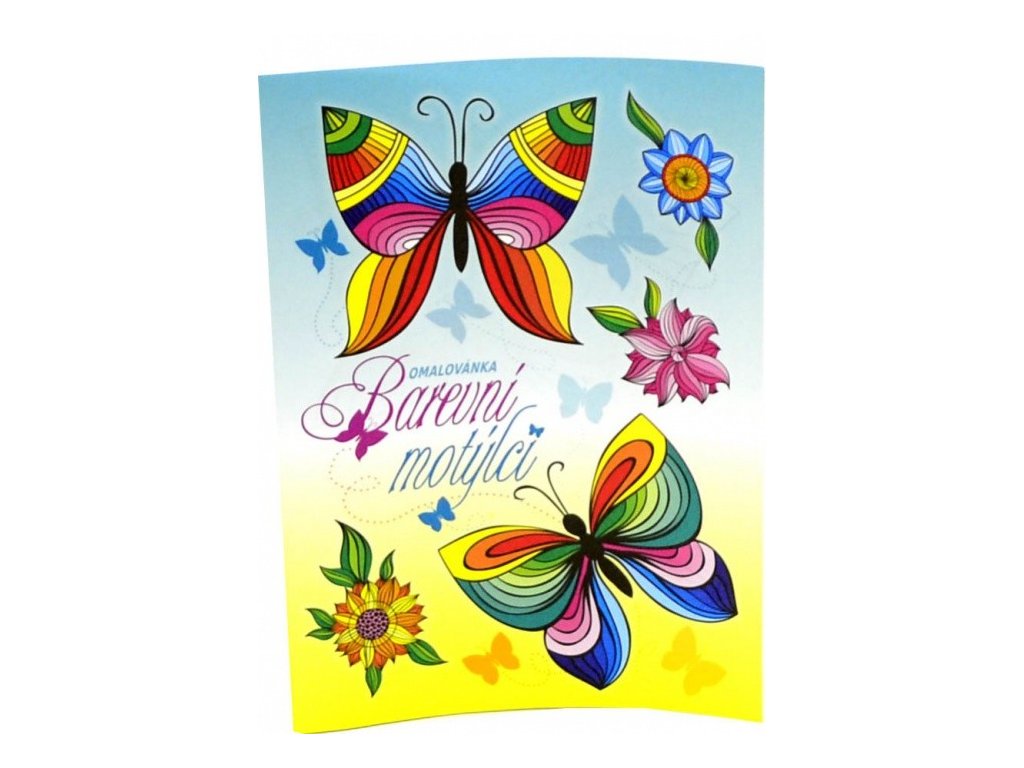 Omalovánky A5 - Barevní motýlci - B0417. 8-ti listé včetně obálky, barevná předloha a k ní kontura k vybarvení.Doplňkové parametry