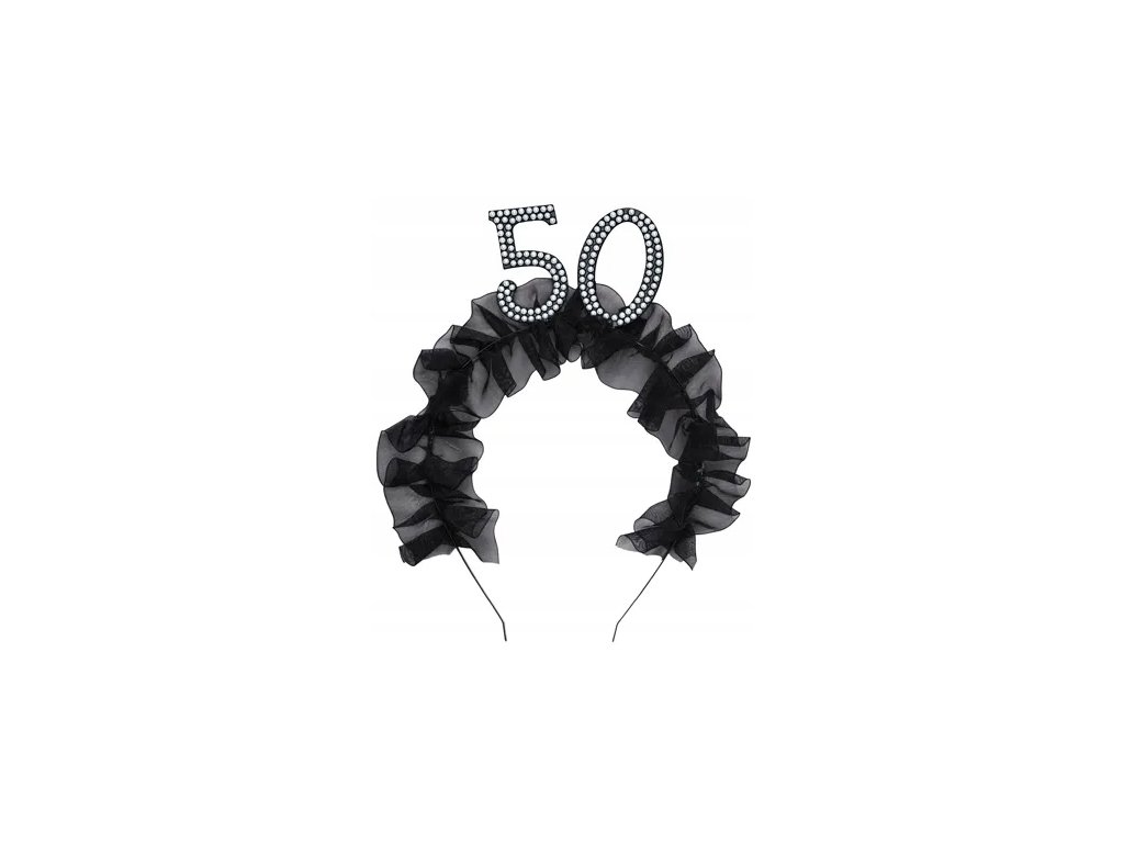 Čelenka s černým látkovým volánem a číslicí 50,zdobená perličkami.