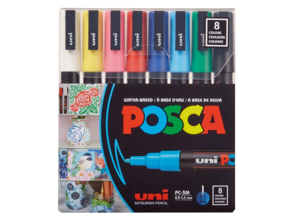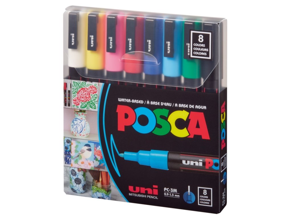 Sada kultovních popisovačů POSCA PC-3M pro úpravu, dekoraci a popis. Bezkonkurenční inkoust s vysokou krycí schopností je určen i na tmavé povrchy. Kvalita a sytost barev ohromí jak umělce tak i fandy, kteří budou nadšeni magickým efektem POSCA. Nabízí neomezené kreativní možnosti. Barvy jsou vrstvitelné, mísitelné, vodou ředitelné linka: 0,9-1,3 mm mix 8 základních barev kulatý, tenký hrot sytá barva, vynikající hustota po zaschnutí voděodolná vyrobeno v Japonsku balení: 1 sadaDoplňkové parametry