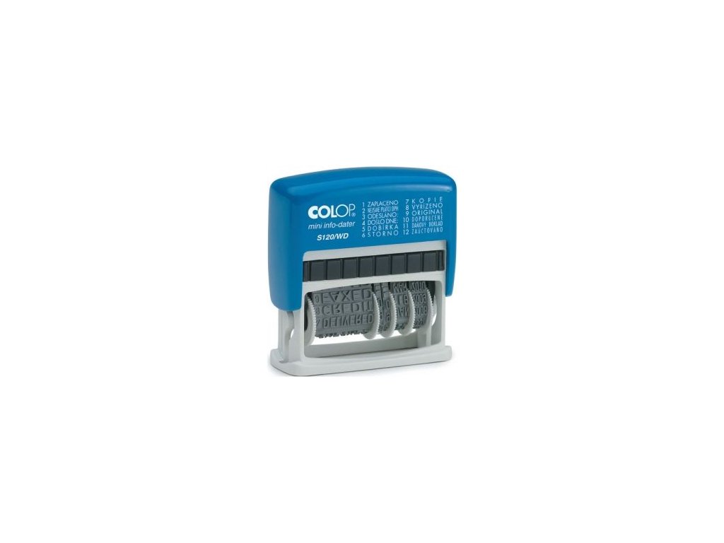 Samobarvicí datumové razítko v plastovém pouzdře z řady COLOP Mini Dater. Výška znaků 4 mm. Typ S120/WD je standartně text modře a čísla červeně v kombinaci s texty: ZAPLACENO, NEJSME PLÁTCI DPH, ODESLÁNO:, DOŠLO DNE:, DOBÍRKA, STORNO, KOPIE, VYŘÍZENO, ORIGINÁL, DOPORUČENĚ, DAŇOVÝ DOKLAD, ZAÚČTOVÁNO.Doplňkové parametry