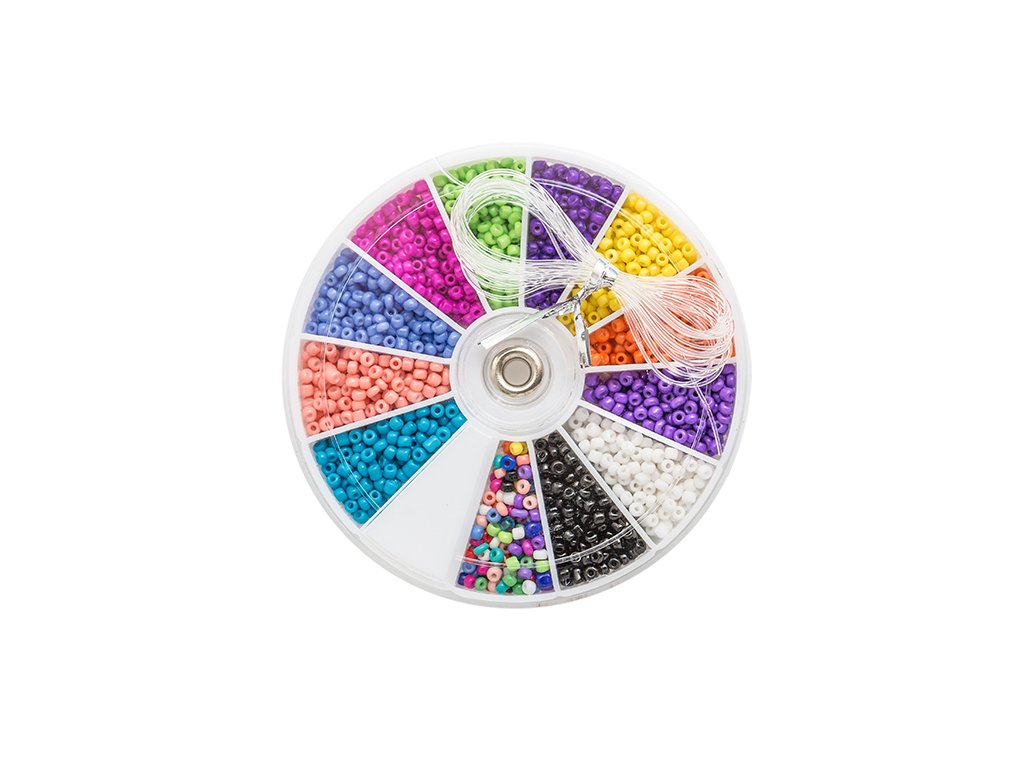 Sada obsahuje skleněné korálky ve 12 barvách (každá po 1,5g) a 1,5m flexibilního vlasce.