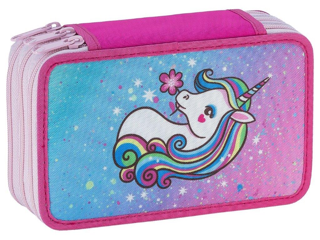 Třípatrové penály pojmou nejvíce psacích a školních potřeb. První patro obsahuje 8 gumiček na pastelky, 2 gumičky na tužky a jednu větší na pero, gumičky ořezávátko i gumu a malou uzavíratelnou kapsičku na drobnosti. Ve druhém patře je umístěna průhledná kapsička na rozvrh a 9 pevných gumiček na psací potřeby různých velikostí. Třetí část penálu nabízí navíc ještě dalších 15 gumiček na tužky a 2 malé gumičky na např. bombičky do pera. Školní penál třípatrový, prázdný, rozměr 19,5 x 13 x 6,5 cm.Doplňkové parametry