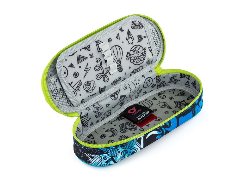 Oválný penál pro všechny potřebnosti ocení spíše starší školáci. Uvnitř pouzdra je síťová kapsička na zip a klopa, na níž jsou umístěny gumičky pro uchycení celkem devíti tužek a propisek, které je potřeba mít přehledně uspořádané a po ruce. Prostor pod klopou pak umožňuje volně umístit další psací potřeby - pastelky, fixy, prostě cokoliv potřebujete.
