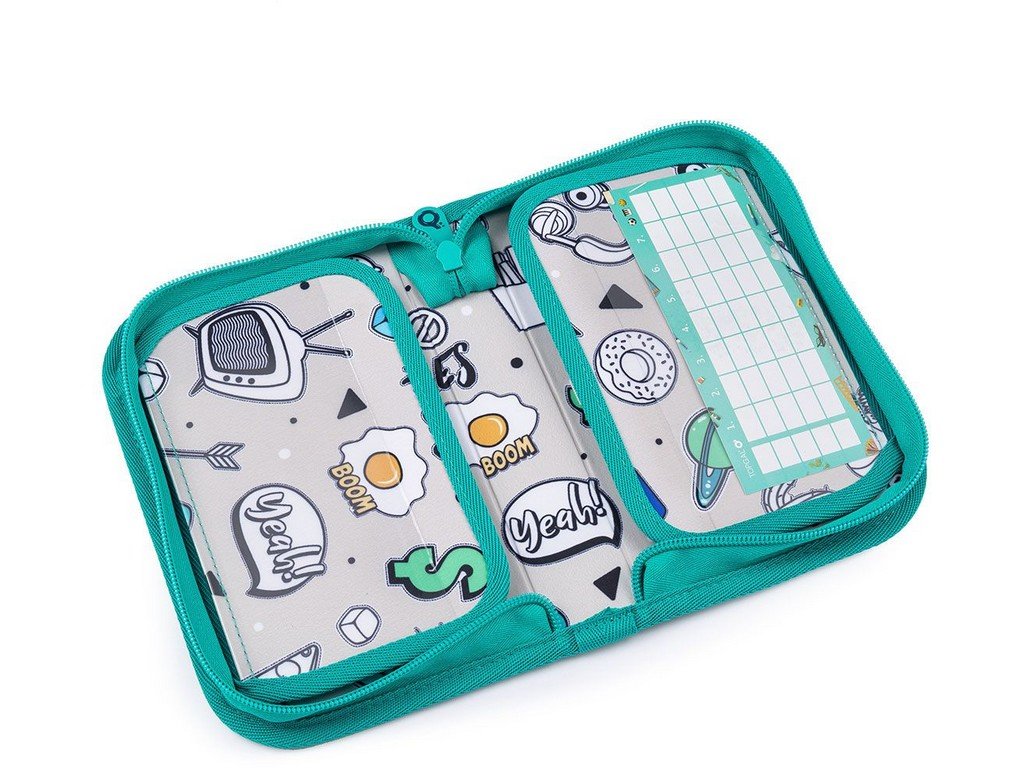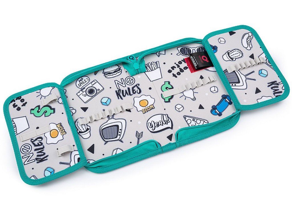 Jednopatrové školní pouzdro se dvěma klopami je vybaveno 21 klasickými gumovými úchyty na pastelky a fixy, čtyřmi širšími úchyty na pravítka, kružítko či nůžky a dvěma většími úchyty na gumu a ořezávátko. Pod klopnou z průhledné folie najdete rozvrh hodin, ale třeba poslouží i na taháky :-) Penál je polstrovaný, takže spolehlivě ochrání všechny psací potřeby vašich dětí. Zapínání je řešeno kvalitními zipy s velkými taháčky, které umožňují dětem snadnou manipulaci s pouzdrem. BONUS: Vnitřní podšívka školních penálů je vyrobena z šedé látky a obrazce na ní vytištěné je možné vybarvovat! Doporučujeme k vybarvení použít klasické pastelky, fixy by se mohly rozpíjetĎ POZOR:Neperte penál v pračce! Je vyztužen papírem a ten praní rozhodně nepřežije.Doplňkové parametry