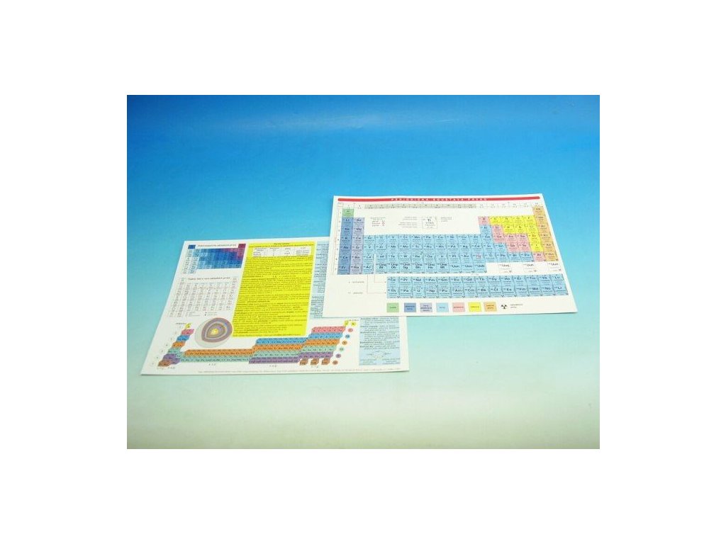 Praktická zalaminovaná oboustranná periodická tabulka, umožňující díky přehlednému zařazení informací jednoduchý a rychlý přístup k údajům, které charakterizují vlastnosti jednotlivých prvků. Jedna strana obsahuje periodickou soustavu prvků a informace o oxidačním a protonovém čísle, relativní atomové hmotnosti, značce, českém i latinském názvu, elektronové konfiguraci a elektronegativitě prvku. Druhá strana tabulky obsahuje informace o elektronové konfiguraci jednotlivých prvků a přehled názvosloví anorganické chemie. Tabulka je určena všem zájemcům o chemii, žákům základních škol a středoškolákům. Díky zalaminování je tabulka odolná vůči poškození.