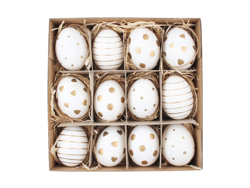 Vajíčka plastová se zlatým dekorem na zavěšení 6 cm, 12 ks v krabičce Plastová vajíčka se zlatým peříčkem v sáčku Vajíčka využijete k různým dekoračním a aranžérským účelům. Můžete s nimi ozdobit věnce, květinové vazby nebo je můžete jednoduše zavěsit třeba na větvičku. Krásné designové zpracování s jemným dekorem zlatého peříčka vynikne téměř v každém interiéru. 12 kusů vajíček v kraftové krabičce, mix motivů.Doplňkové parametry