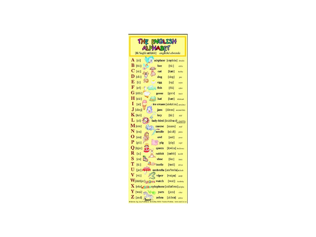Přehled abecedy s přepisem anglické výslovnosti, slovem a obrázkem k zapamatování.Doplňkové parametry