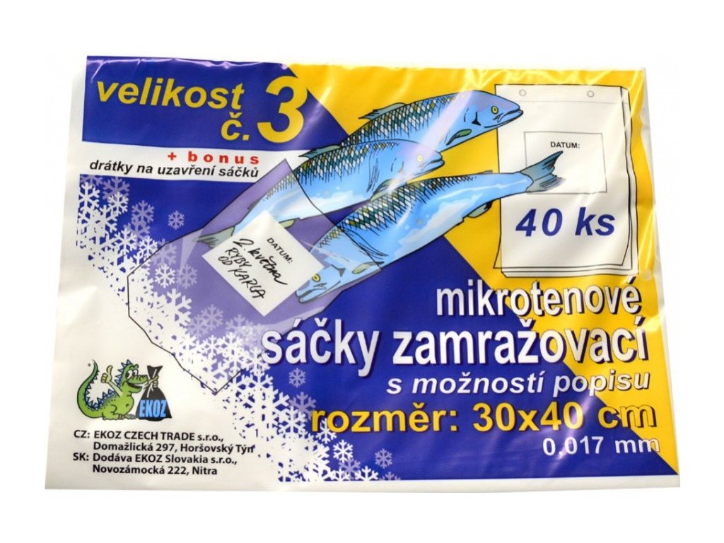 Zamrazovací sáčky č. 3 - 30 x 40 cm - SMZ-0005. Tyto mikrotenové sáčky jsou ideální pro zamražení veškerých potravin. Díky bílemu poli na každém sáčku je můžete snadno popisovat. Zamrazovací sáčky, tloušťka materiálu 15 mic. Rozměry: 30 x 40 cm. belené v odtrhávacím bloku Balení obsahuje: 40 ks + vázací drátky.Doplňkové parametry